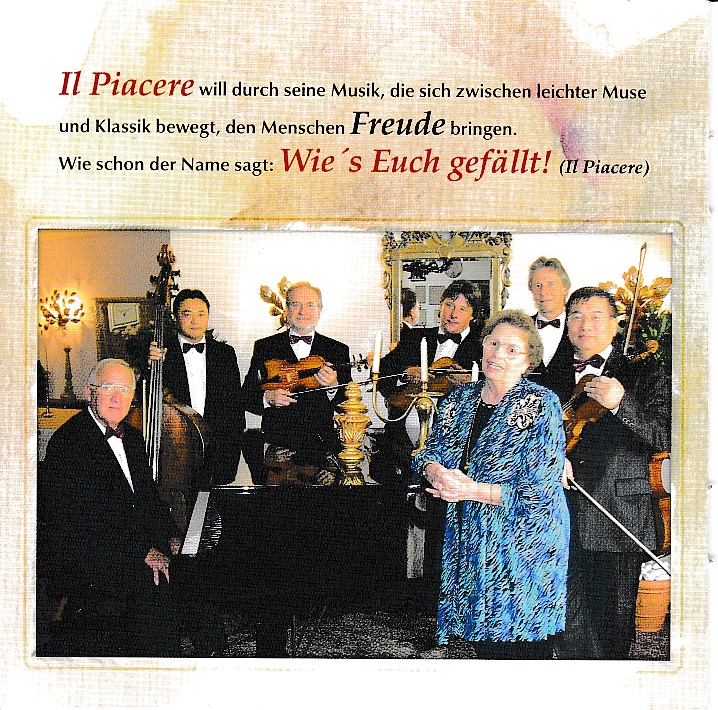 高畑の娯楽音楽を好む音楽的嗜好とドイツで出会ったオペレッタや舞台音楽の魅力的な旋律と舞台のワクワク感、そしてヨーロッパの空気、それらを総合して理想の演奏形態を突き詰めて行った物がこのIL PIACEREなのです。 IL PIACEREの編成は基本的にピアノトリオですが、自由に変化します。